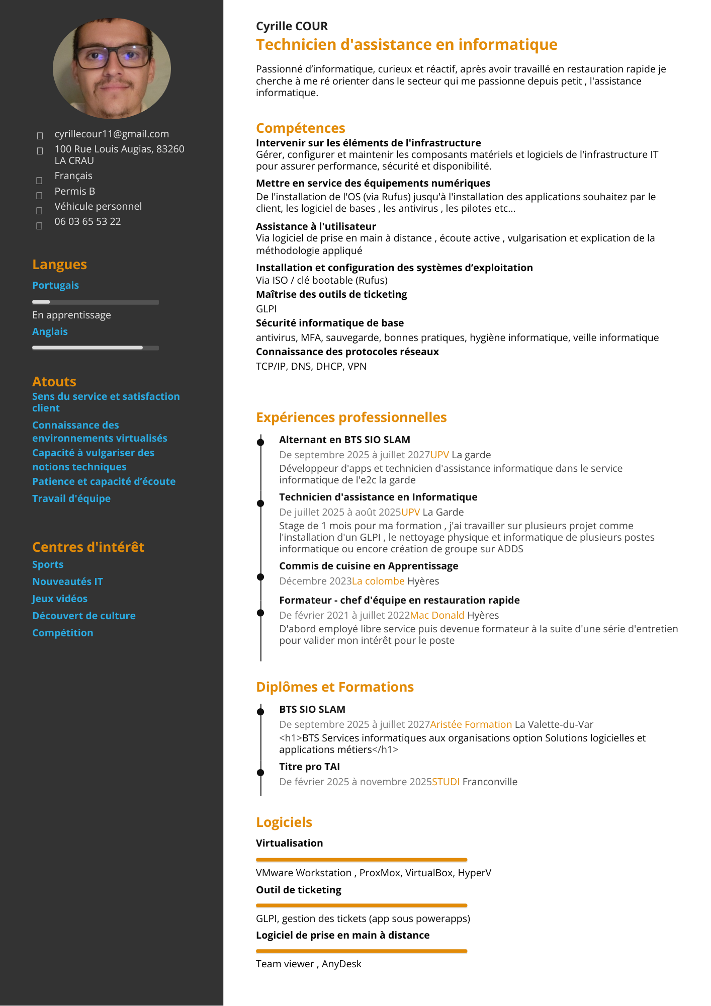 def portfolio(): nom = 'Cyrille COUR', mail = 'cyrillecour11@gmail.com', formation = 'BTS SIO SLAM', lieu = 'La Crau', objectif = 'Devenir développeur logiciel', langages = [ 'Python', 'HTML', 'CSS', 'JavaScript' ]